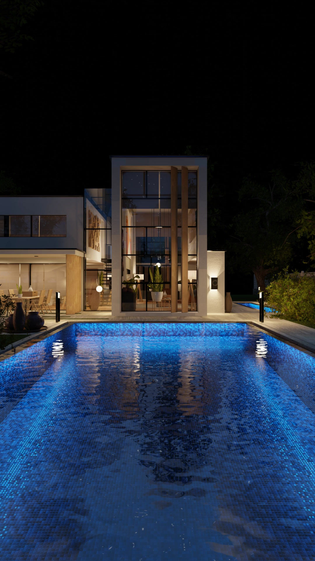Des cheminements nocturnes ont été sublimés grâce à un éclairage bleu nuit discret et apaisant, garantissant confort, sécurité et raffinement.